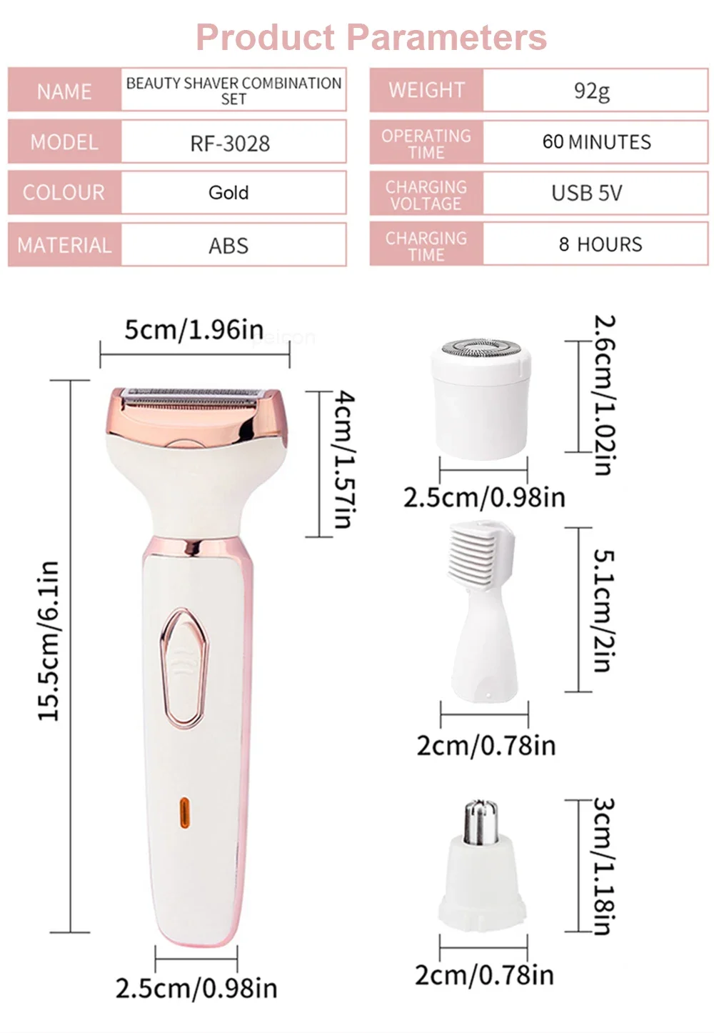 * 4-in-1 Multifunctional Heads: This lady’s electric razor comes with 4 interchangeable functional heads for shaving, eyebrow trimming, nose trimming and light hair trimming.It effectively removes unwanted / excessive hair from your face, arms, legs, body and underarm.It is especially a must for summer before you put on your bikini!